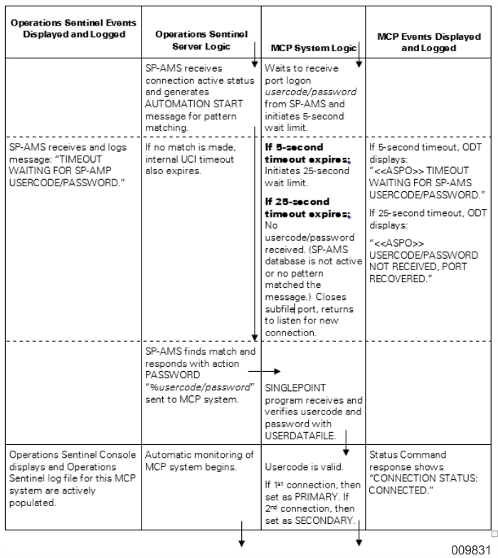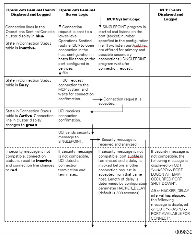 The next three tables show the initial connection sequence between the Operations Sentinel server and the interface software. The logic is the same for SINGLEPOINT (the production instance of the interface software) and SINGLEPOINTTEST program (the test instance of the interface software), so only SINGLEPOINT is shown in these tables.