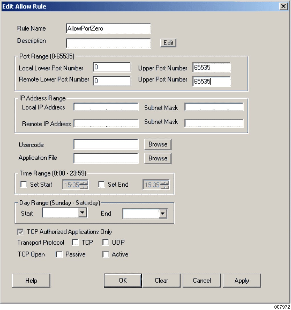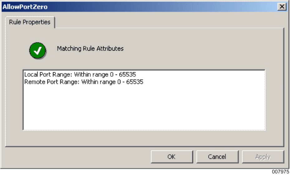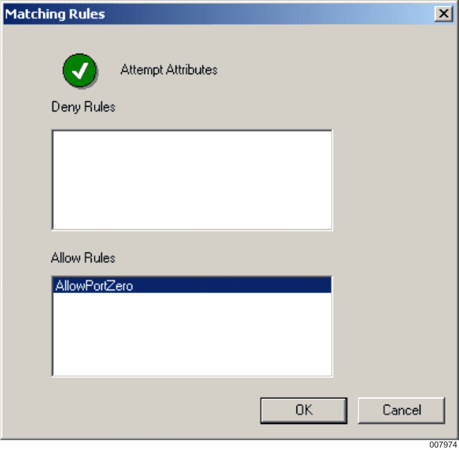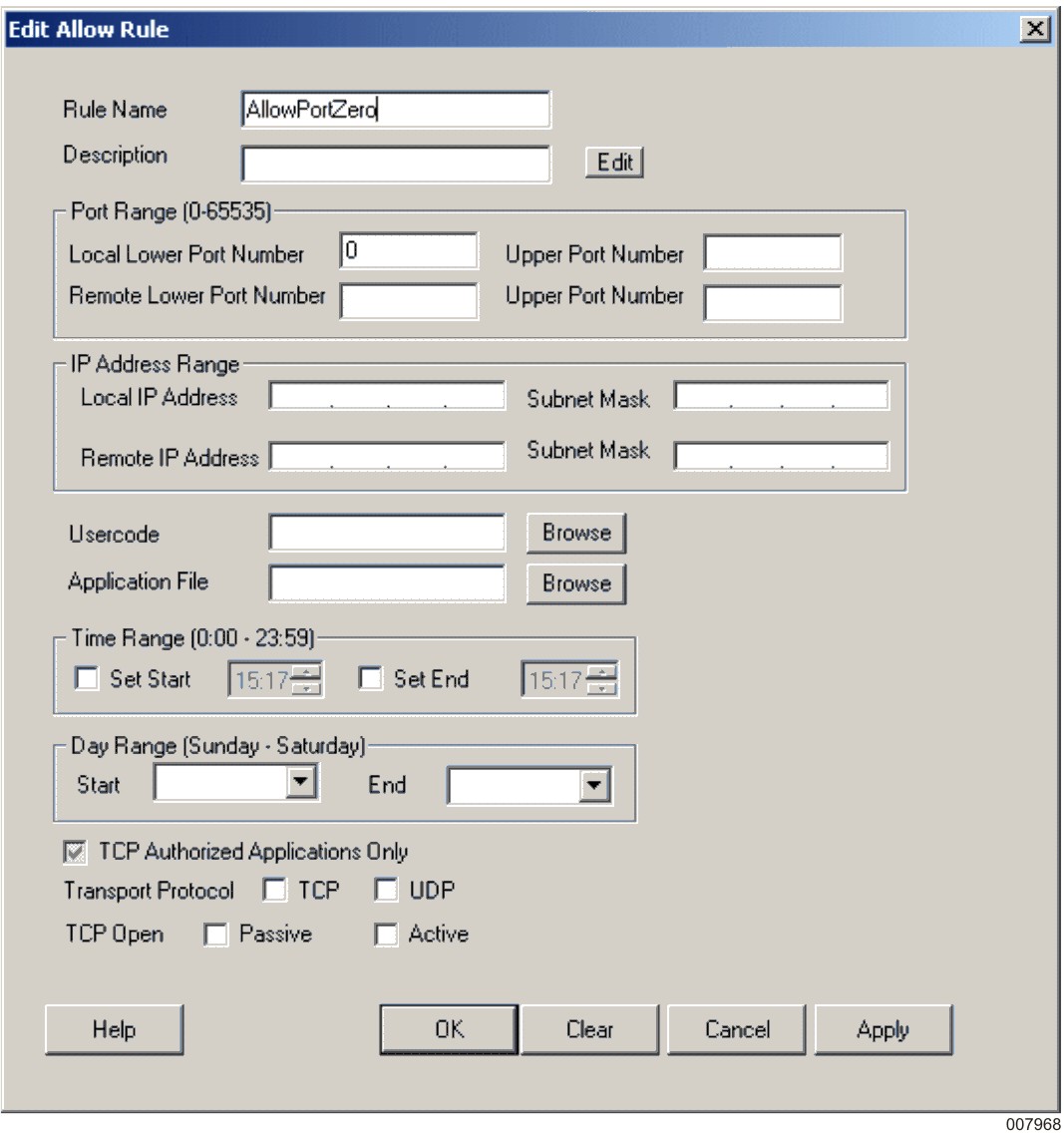 For this scenario, click Allow and add one allow rule that permits only local lower port number 0.