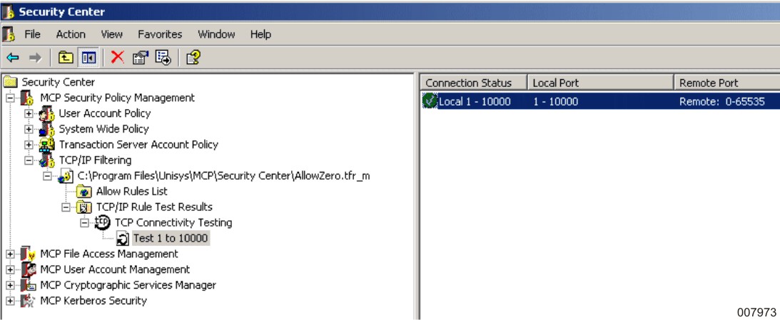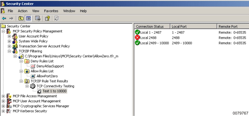 Verify that three results now appear, indicating that traffic is allowed on local ports 1 to 2487, traffic is denied on local port 2488, and traffic is allowed on local ports 2489 to 10000.