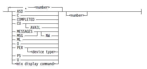 ──ADM─┬────────────────────────────────────────────────────┬───┤ ├─ - ────────────────────────────────────────────────┤ ├─ ST ───────────────────────────────────────────────┤ ├─ OK ───────────────────────────────────────────────┤ ├─ GO ───────────────────────────────────────────────┤ │ ┌─◄────────────────────────────────────────┐ │ ├─────┬─┴─ (<timed options>) ─┬─ <number> ───────┬─┴─┤ ├─ + ─┘ └─ DELAY <number> ─┘ │ │ ┌─◄──────────── , ────────────┐ │ ├─────┬─ EVENT ─┴─┬─ C ─────────────────────┬─┴──────┘ └─ + ─┘ ├─ COMPLETED ─────────────┤ ├─ MESSAGES ──┬─┬─────────┤ ├─ MSG ───────┘ └─ NW ────┤ ├─ PER ── <device type> ──┤ ├─ <mix display command> ─┤ └─ /1\ ─ DELAY <number> ──┘