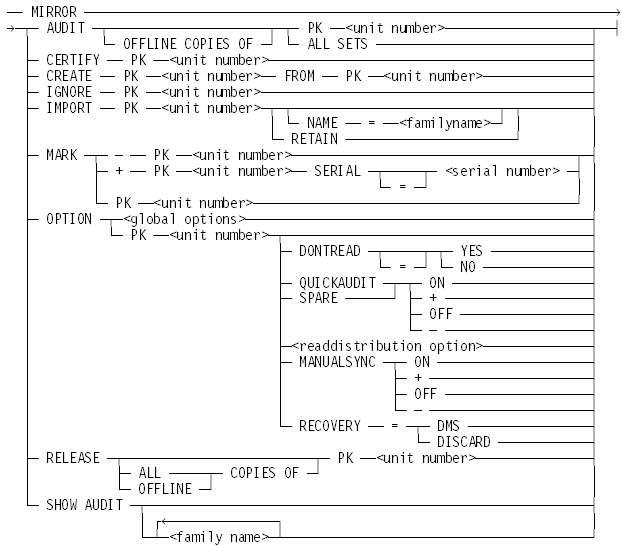 The MIRROR (Mirror Disk) command controls the use of disk mirroring on the system. The command initiates an independent runner named MIRROR_CREATE. For a description of disk mirroring, refer to the System Operations Guide.