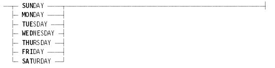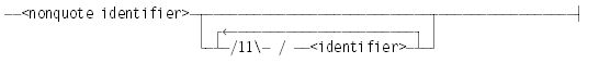 ──┬─ <letter> ─┬─┬────────────────────────────────────┬────────────────┤ ├─ <digit> ──┘ │ ┌◄──────────────────────────┐ │ │ └─┴─ /16\ ─┬─ <letter> ─────┬─┴──────┤ │ ├─ <digit> ──────┤ │ │ ├─ <hyphen> ─────┤ │ │ └─ <underscore> ─┘ │ │ ┌◄──────────────────────────────────────┐ │ └─ " ─┴─ /17\ ── <nonquote EBCDIC character> ─┴─ " ─┘