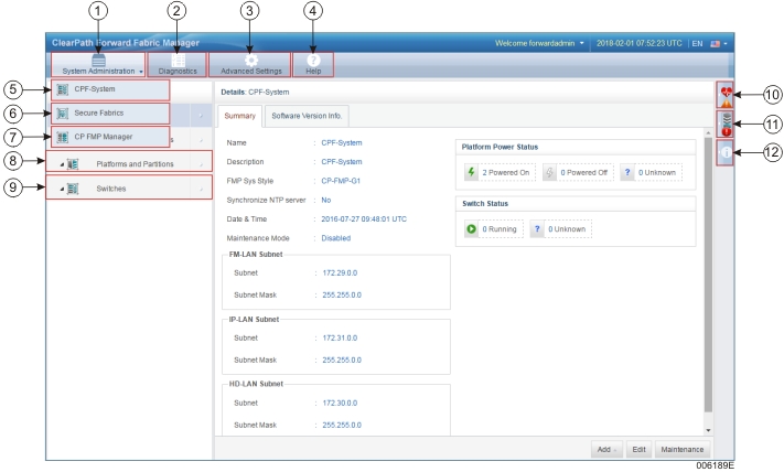 1 | System Administration | Allows you to choose between CPF System and Secure Fabrics windows. It also allows you to access the CPF FMP Manager user interface. |