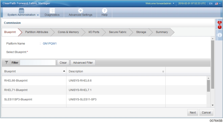 Commissioning is the process of creating a partition image by using the Fabric Manager user interface. Commissioning associates software with hardware resources, resulting in a partition image. You begin the commissioning process by selecting a software template called a blueprint. The blueprint supplies the gold image (that is, the software that will run in the partition). Then you specify values for any additional required attributes, such as the following: