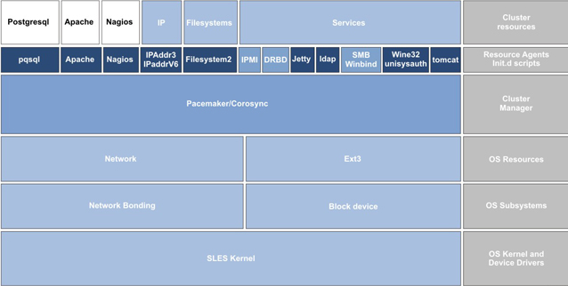 The Unisys highly available Fabric Manager uses several modules such as services, resources agents, network and file availability as well as a stable Linux kernel. The following figure shows the Unisys supplied resource agents in dark blue; the SLES High Availability Extension package components in medium blue; and the operating system resources, subsystems, kernel, and device drivers provided by the SLES kernel in gray.