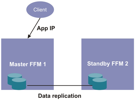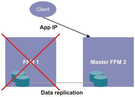 In the case where the master Fabric Manager node fails, the second (standby) node automatically becomes the master node. The application access point automatically moves to the second node so that clients can continue to have access, as shown in the following figure.