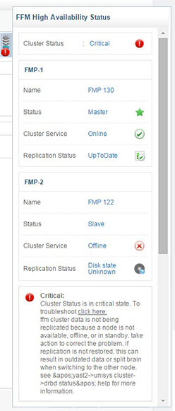 In a high availability (HA) cluster, one of the FMP serves as master node and the other serves as slave node. The FFM High Availability Status pane provides the status of each node and also displays an alert based on the status of both the nodes.