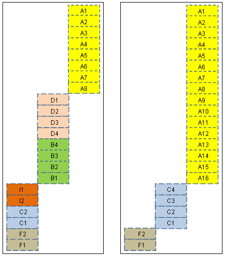 The example on the left has three 2-core partitions, two 4-core partitions, and one 8-core partition. The example on the right has one 2-core partition, one 4-core partition, and one 16-core partition.