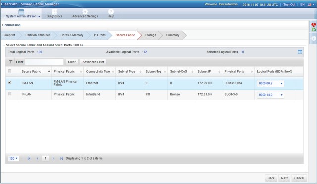 After the secure fabric has been created, you associate partitions with it. The easiest way is while commissioning the partition, using the following screen.